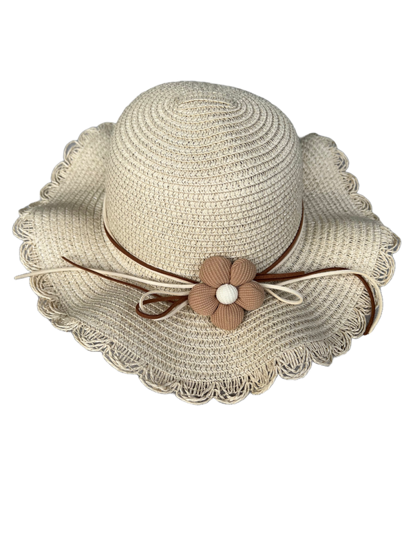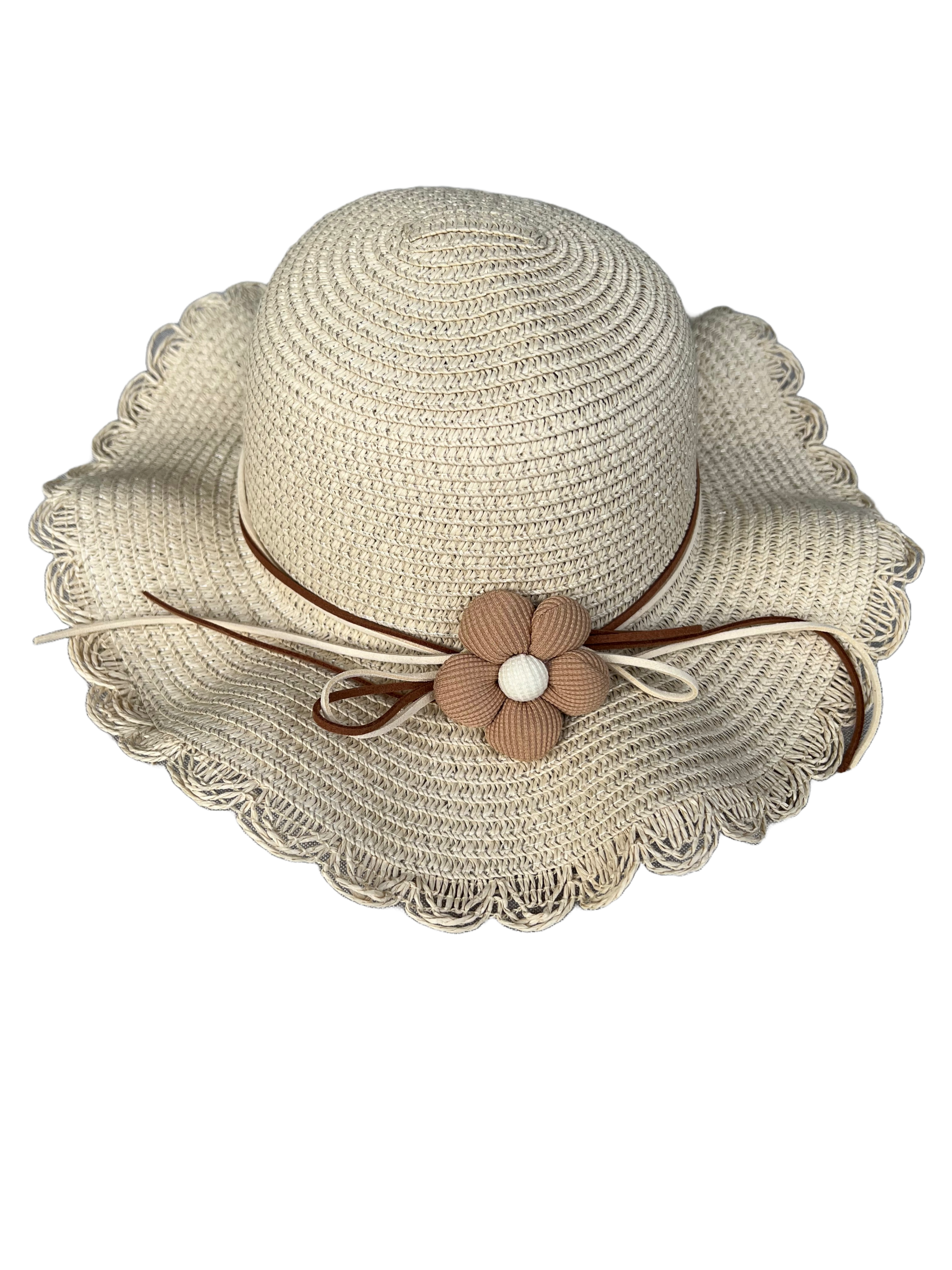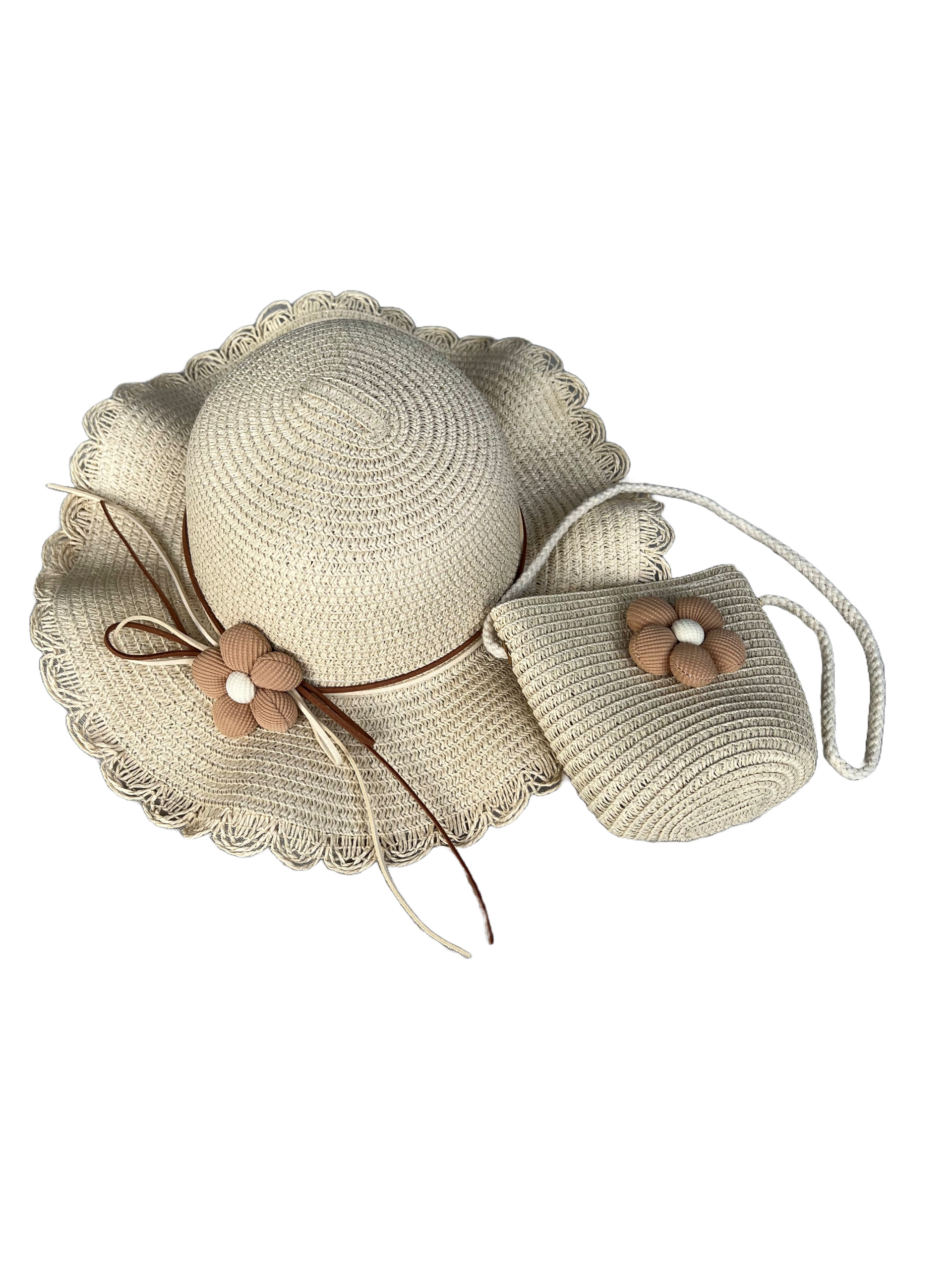 Schattig hoedje met bijpassend tasje. Aan de binnenkant zit een touwtje, waarmee de hoed naar de gewenste maat gemaakt kan worden.